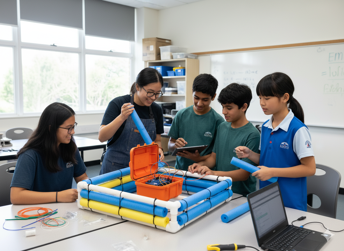 Drawing inspiration from reef survey methods used by the Australian Institute of Marine Science, students built four Ocean Monitor Buoys equipped with BBC Micro:bits programmed in MakeCode. These devices collected time-series data on sunlight, temperature, and salinity, giving students firsthand experience with environmental monitoring and data-driven inquiry.